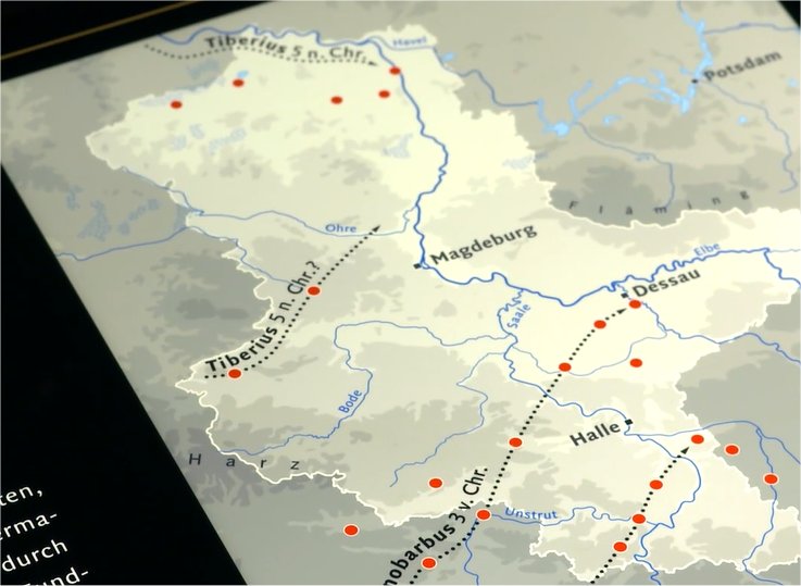 Vielen Dank, El Quijote! Harald Meller zeigt in dem Video Die Erfindung der Germanen in Minute 5:54 eine Karte, auf der bzgl. des Tiberius-Feldzuges in 5 n.Ch. nur zwei Punkte als Münzfundstellen ausgewiesen sind (siehe Anhang). Das könnten - so wie es Hermundurus schreibt - tatsächlich Schöningen und Alleringersleben sein. Von da aus zeigt ein Pfeil nach Nordosten, ohne dass weitere Fundstellen angedeutet sind. Ich werde mal das vorgeschlagene Buch Geldgeschichten aus Sachsen-Anhalt versuchen ausfindig zu machen. Sicherlich hatte Tiberius die Langobarden an der Unterelbe zum Ziel, welche Route er aber eingeschlagen hat, scheint mir sehr wenig bis gar nicht belegt zu sein, oder hat da jemand weitere Hinweise???
