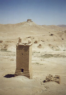 Westlich der Stadt liegt das Tal der Gräber. Hier stehen auf Anhöhen Turmgräber. Sie dienten den wohlhabenden Bürgern als Begräbnisstätte. Am Sockel der Turmgräber sind kleine Kammern eingebaut, in denen die Toten bestattet wurden. Diese so genannten Loculi waren von außen erreichbar. Sie wurden durch verzierte Grabplatten verschlossen.