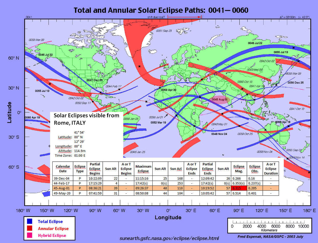 Deine Anmerkung, dass die Menschen auf dem afrikanischen Kontinent, nicht aber die Menschen in Rom u. Italien am 1. Aug. 45 n. Chr. eine totale Verfinsterung der Sonne beobachten konnten ist richtig. Dennoch war diese SoFi in ihrer partiellen Phase auch in Rom (falls die Witterung mitspielte) definitiv sichtbar! Das ist nicht nur meine Meinung, sondern auch die der NASA (Klick mal im "Catalog of Solar Eclipses" auf die "Catalog Number" vor dem Kalenderdatum; da wird der Sichtbarkeitsbereich angezeigt).