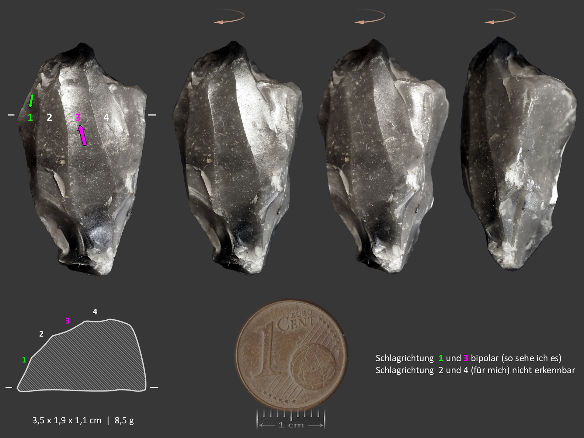 Der Kern weist vier eindeutige konkave Abschlagbahnen (Negativ-Spuren) mit Längen von 17 bis 29 mm