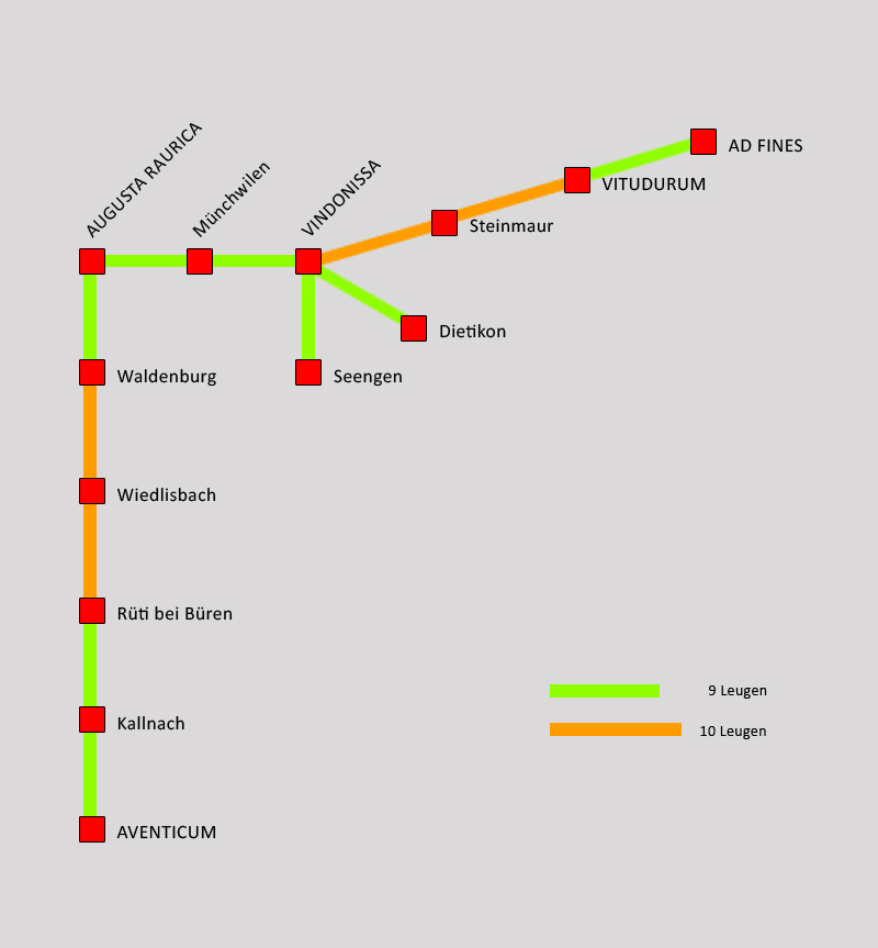 [Edit] Wir reden hier über die beiden Militärrouten im frühkaiserzeitlichen Helvetien. Bei Ad Fines (Pfyn) lag die Grenze zu Rätien. Laut Itinerarium Antonini war die im einzelnen nicht näher bekannte Strecke weiter nach Arbor felix 20 Leugen lang.