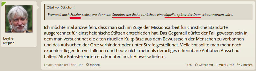 soll sich auf die Irminsul bzw ihren Standort beziehen? Das ist diesem Beitrag nicht anzusehen...Ich möchte mal anzweifeln, dass man sich im Zuge der Missionsarbeit für christliche Standorte ausgerechnet für einst heidnische Stätten entschieden hat. Das Gegenteil dürfte der Fall gewesen sein in dem man versucht hat die alten rituellen Kultplätze aus dem Bewusstsein der Menschen zu verbannen und das Aufsuchen der Orte verhindert oder unter Strafe gestellt hat. Vielleicht sollte man mehr nach exponiert liegenden verfallenen und heute nicht mehr als derartiges erkennbare Anhöhen Ausschau halten. Alte Katasterkarten etc. könnten noch Hinweise liefern.