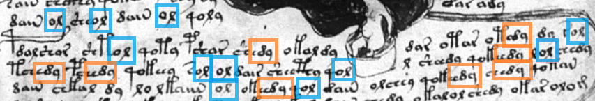 Auch zu 1.: Ein richtiges Prinzip gibt es bei der Zerlegung der VMS Worte nicht. Hier muss man Probieren. Auch im Baskischen hängen Worte manchmal zusammen und manchmal nicht. Mal hat es etwas mit Satzgliedstellungen zu tun, mal mit Betonungen oder ähnlich wie mit den Kommata im Deutschen angezeigt wird, um zusammenhängende Phrasen. Im Manuskript selbst gibt es ja keine Satzzeichen.