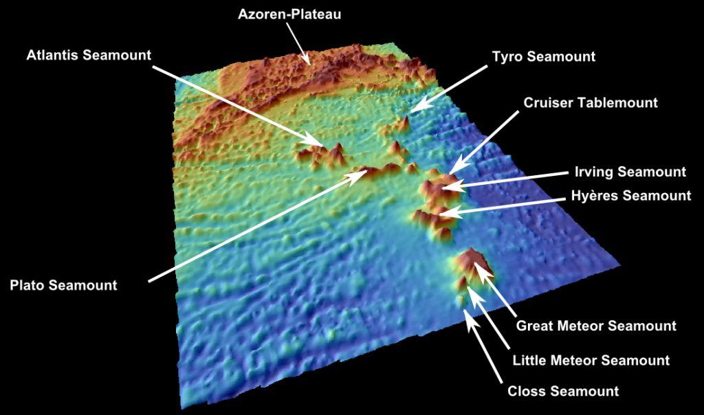 Natürlich hat der Name vielfältige Spekulation angeregt, aber ein Blick auf die angehängte Karte zeigt, daß da beim besten Willen nichts herauszuholen ist, was mit Platos topographischen Angaben in Einklang zu bringen ist. Die Ebene, aus der die seamounts herausragen, liegt 4-5.000 m unter dem Meeresspiegel - so tief sinkt kein Stück Erdkruste mal eben ab.