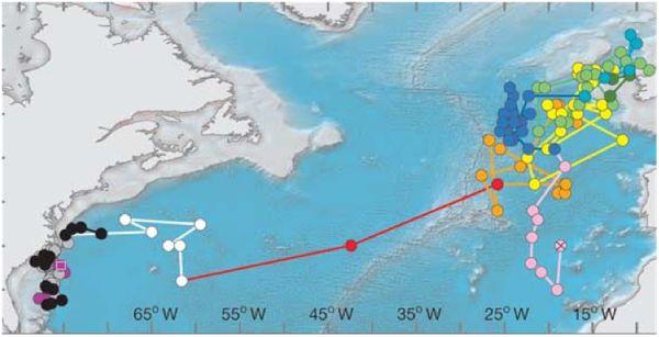 • Ebenso Thunfische, hier mit zeitlicher Auflösung, so daß die Wanderung besser nachvollziehbar ist: Von der nordamerikanischen Küste mit der transatlantischen Strömung zu den Azoren, dort Zwischenmahlzeit, dann weiter Richtung Irland, und schließlich Überwinterung (oder von einem Fischer erwischt?) vor Madeira. Der Kontinentalschelf wird gemieden, da gibt es offensichtlich zu wenig Beute.