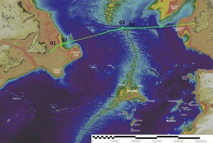 Einen hab ich noch, nämlich einen genaueren Blick auf Küstenverläufe und Inseln zur fraglichen Zeit. Die angehängte Karte (Quelle: What’s down there? Mapping the ocean floor , von mir leicht beschnitten und mit Namen versehen) gibt einen ersten Überblick, was sich unter dem Atlantik so alles an ridges und seamounts findet. Wer näher an Details hernzoomen möchte, sei verwiesen auf http://www.arcgis.com/home/webmap/viewer.html?services=6348e67824504fc9a62976434bf0d8d5. Potentiell noch besser, in der Praxis aber leider speicherfressend und etwas instabil, die "amtliche" Karte der EU EMODnet Bathymetry Portal