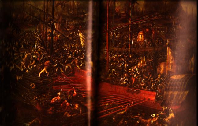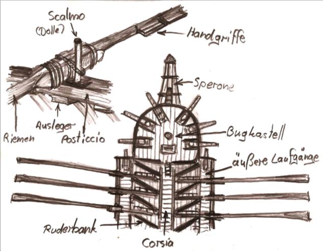 Bei diesem Ausschnitt des Lepantogemäldes sind einige Galeassen zu sehen (die Dreimaster). Auf dem Schiff vorn rechts sind die Riemen waagerecht festgelegt . Man sieht eine große Anzahl von Söldnern an den Borden. Ich nehme an, dass über die Riemen Planken gelegt sind. Leider kann man durch den Pulverdampf die Corsia nicht sehen. Auch Bug-und Heckkastelle sind mit Männern vollgestopft.
