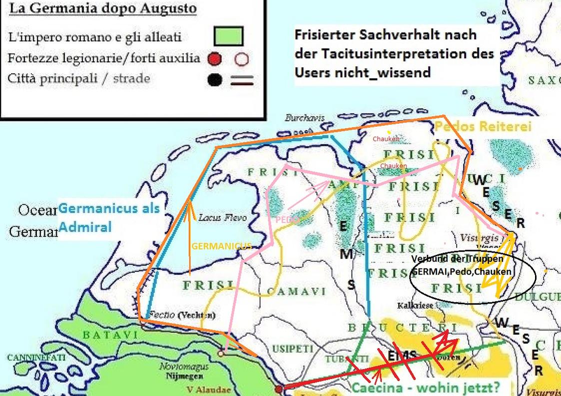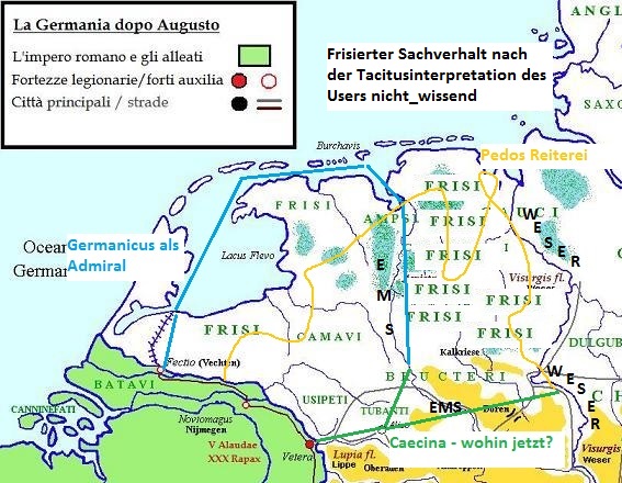 Ich auch nicht. Habe ich auch nichts gegen eingewandt: Du argumentierst aber mit Pedo, der durch das Gebiet der Friesen geschickt wurde, dass die Römer nicht an die Ems sondern (gegen die ausdrücklich Aussage des Tacitus) an die Weser zogen: