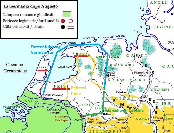 Germanicus fährt immer noch zur Ems, wohin Caecina zieht ist nicht so ganz klar und Pedo reitet wie immer durch das Gebiet der Friesen, welches jetzt aber nicht mehr zwischen Rhein und Ems sondern zwischen Rhein und Weser liegt. Ein paar Stämme sind dafür aus der Geschichte gestrichen worden.