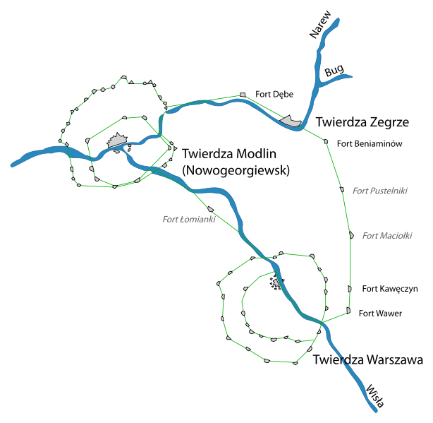 ansonsten ist überall der innere Fortgürtel älter als der ausgelagerte/vorgeschobene äußere (als Reaktion auf die Reichweite der Artillerie, zum Schutz der Kernfestung) - in Warschau aber war der äußere Fortgürtel schon 1873 geplant.