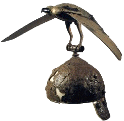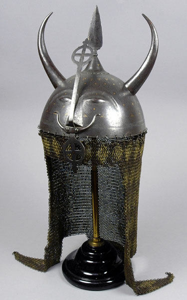 Zwar weden verzierte Helme auch für die Schlacht überliefert, aber nicht mit so hohen Aufbauten - es sei denn, der Helm umschließt den Kopf, wie bei den Turnierhelmen. Auf Helmen, die wie Kappen auf dem Kopf sitzen, wäre der Schwerpunkt zu hoch, so dass er eher balanciert werden müsste, weil er schon bei Neigung des Kopfes herunterfallen müsste. Dagegen beim eher steifen Schreiten in einer Zeremonie oder (vorsichtigem) Tanz kann man solche Aufbauten eher auf dem Kopf behalten.