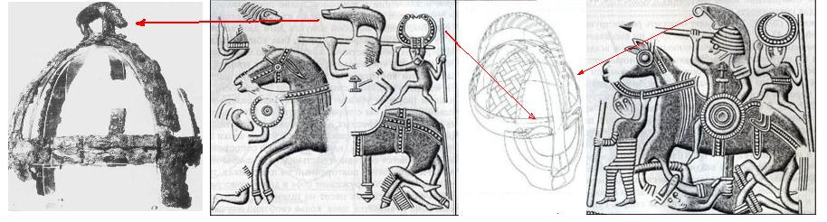 Nun zu den "Hörnern": Geführt werden sie offenbar von göttlichen Sieghelfer. Sie lenken die Speere, die eigentlich von den Reitern geführt werden. Natürlich könnte man jetzt vorschnell jeden Zusammenhang mit den irdischen Helmen leugnen, da es sich ja um übernatürliche Wesen handelt, aber dass Motiv taucht auch auf Helmen auf. (Diese beiden Hörnerhelm-Träger tauchen nicht in Schwert-Tänzer-Pose auf.)