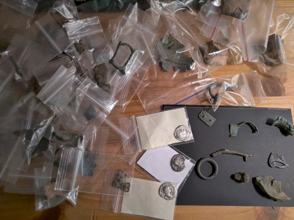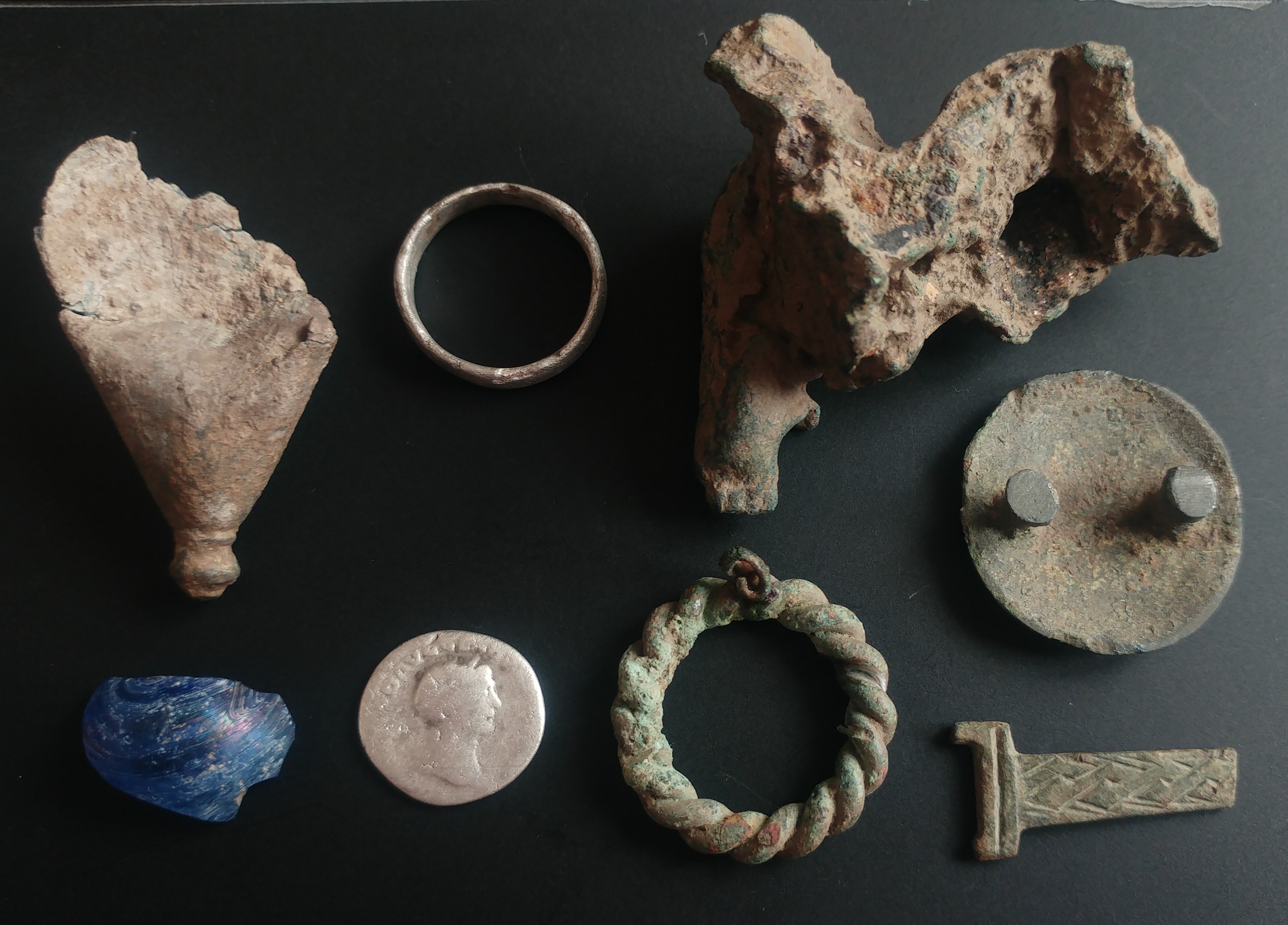 Das Gebiet um Merseburg mausert sich immer mehr zur Fundgrube. So konnte ich seit den Osterfeiertagen eine weitere Fundstelle lokalisieren. Diese liegt nur 1000 m Luftlinie zum Fundplatz des Thekenbeschlages (Sichtbereich!) und der Schleuderbleie am Saalehochufer. Diesmal fand ich einen abgegriffenen Denar des Trajan, das Fragment eines Ortbandes für einen Pugio vom Typ Künzing (2./3. Jh. n. Chr.), einen Riemenbeschlag (3. Jh. n. Chr.), das Fragment einer Schwertscheidenklemme, eine gebrochene kobaltblaue Glasperle, ein größeres Fragment einer römischen Bronzefigur sowie einen handgeschmiedetene silbernen Fingerring.
