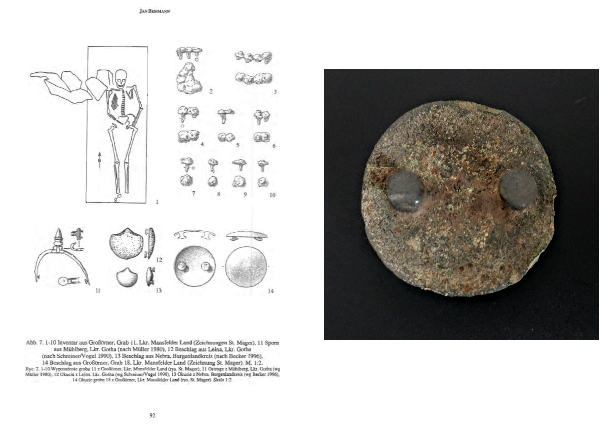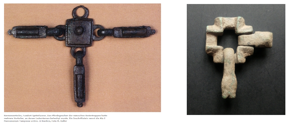 die Funde von römischer Militaria des 2./3. Jh. n. Chr. konzentrieren sich zwischen dem Saale-Elster-Raum, Südharz und Thüringer Wald. Die restlichen Funde in der Germania Magna sind Einzelfunde. Die Karte von Bemmann (2003) muss mittlerweile aber gründlich ergänzt werden, da man mittels Detektor viele Neufunde hat. Gestern fand ich einen Riemenverteiler vom Pferdegeschirr (rechtes Bild). Als Vergleich habe ich ein ähnliches Stück mal nebenan gestellt. Die Ärmchen meines Stückes sind unterschiedlich lang und noch komplett genietet. Das Stück ist ungereinigt.