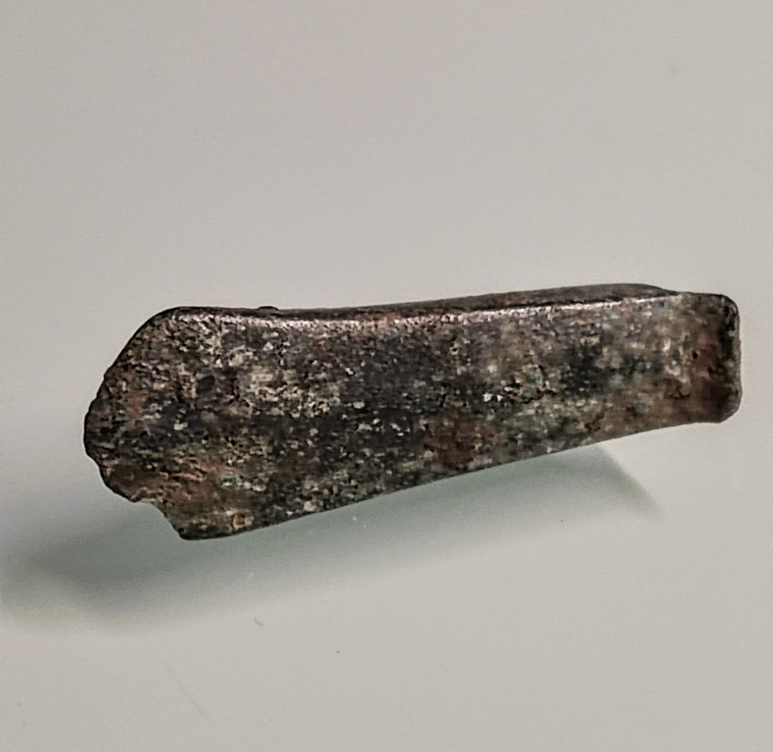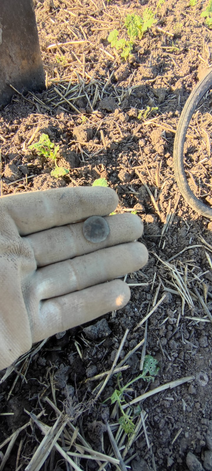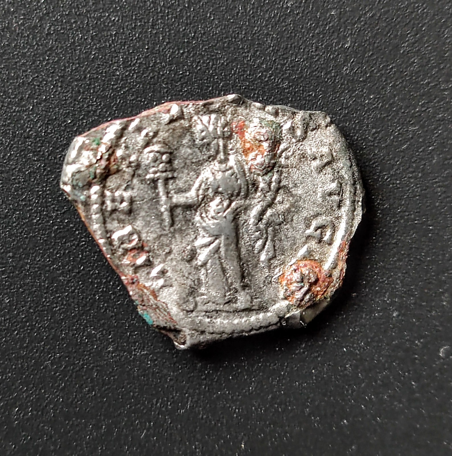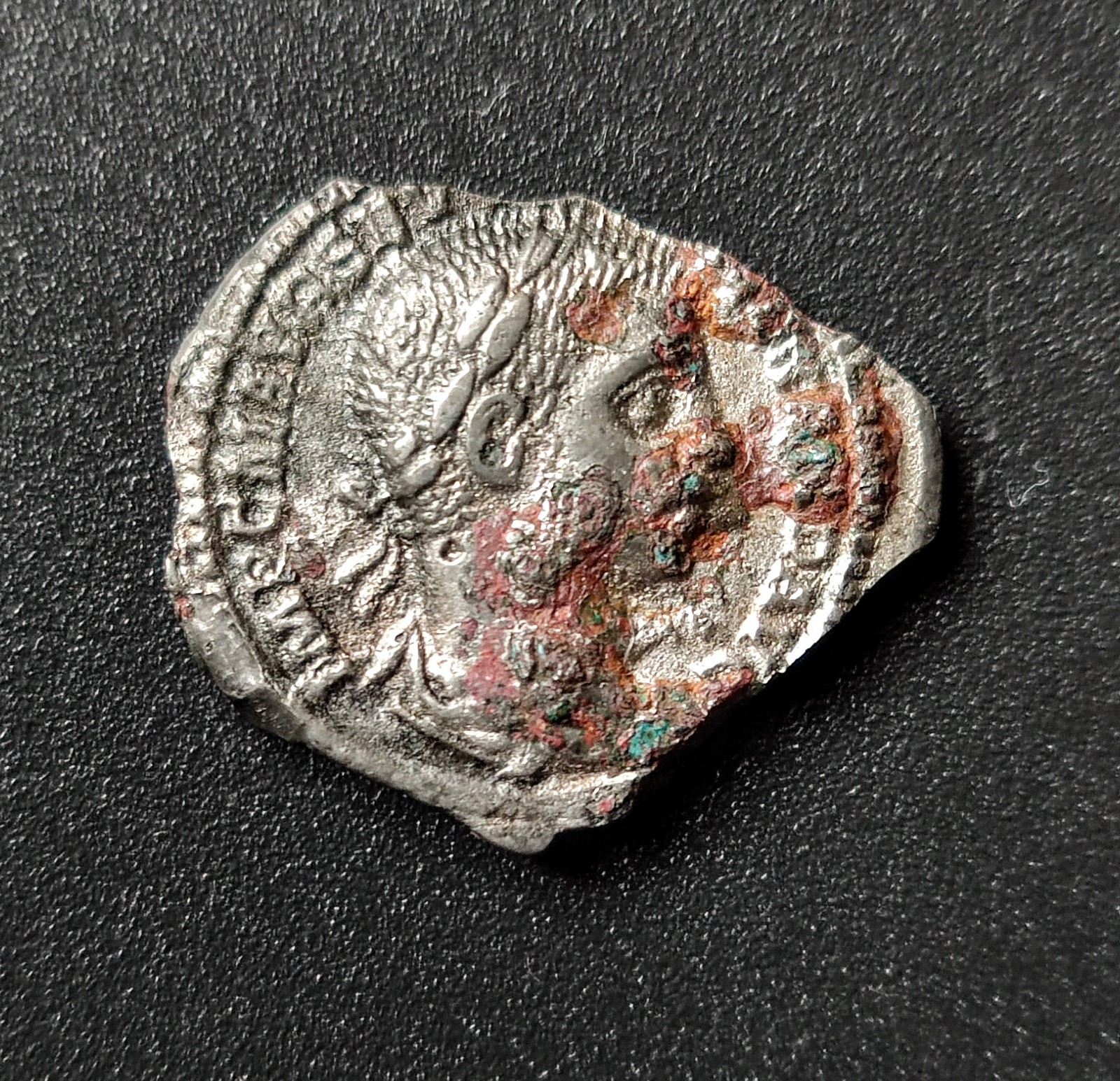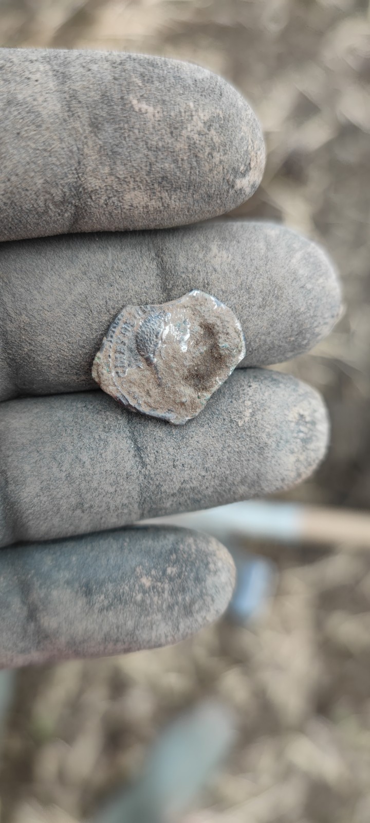 Von gleicher Übergangsstelle wo ich die norisch-pannonische Fibel fand, habe ich weitere römische Funde. Dieses Mal aber aus dem 3./4. Jh. n. Chr. Der Riemenbeschlag (Aufhängeöse) ist nach Prof. Deschler-Erb eindeutig militärischen Ursprungs. Zeitstellung ist 2./3. Jh. Letztere passt sehr gut, da ich in unmittelbarer Nähe einen Denar des Severus Alexander gefunden habe. Das Bodenstück könnte von einer Draggendorff 37 stammen. Der Valens ist klar.
