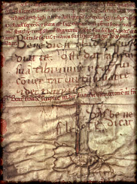 Kannst Du das Original bitte noch mal bügeln? Ich kann gerade neben der Zeichnung bloß bene|dicat entziffern und den Text darüber so halbwegs. (Von dem Text in roter Tinte will ich nicht sprechen, der ist mir zu klein, obwohl er druchaus lesbar ist. Ich lese da etwas von "Michael archangli..."):