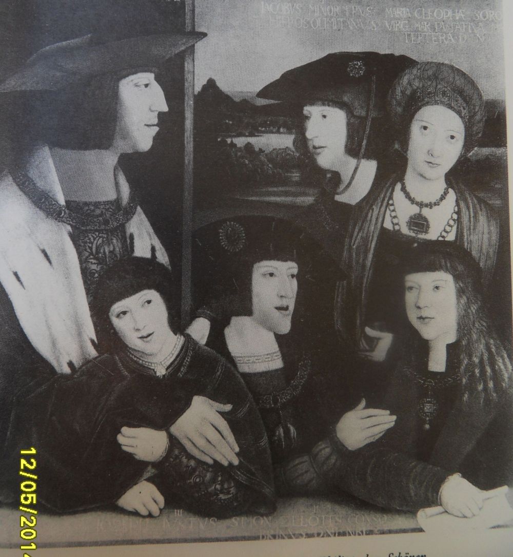 Das ist die Familie von Kaiser Maximilian (erkennbar an der habsburger Unterlippe). Der Junge mit dem langen Kinn und dem offenstehenden Mund ist der spätere Kaiser Karl V. ,der Vater Phillips II. von Spanien.