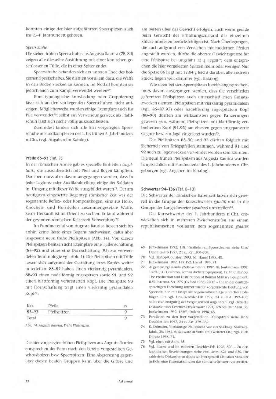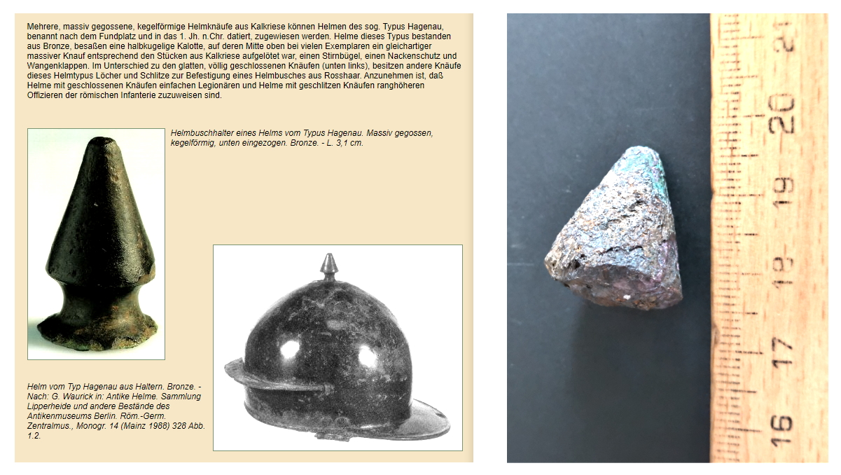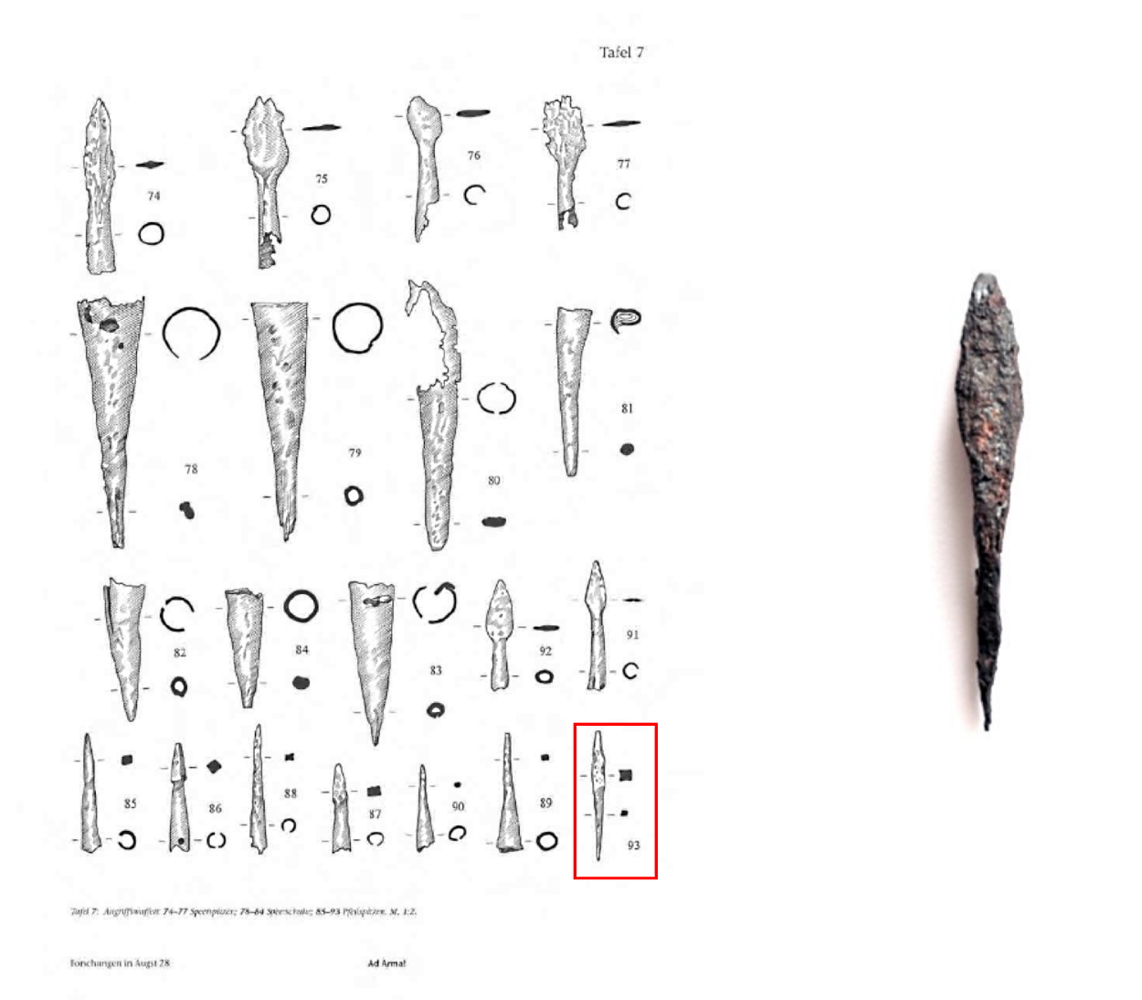Dafür gibt es umso mehr Anzeichen für eine römische Präsenz im Saale-Luppe-Raum. Es zeichnen sich zwei Zeithorizonte ab - augusteisch und severisch. Der gewaltsam abgetrennte kegelförmige Helmknauf aus Merseburg, wo ich dachte das jener zum Typ Niederbieber gehörte, muss revidiert werden. Warum? Größe und Gewicht stimmen nicht überein. Jedoch passt das Fragment zum Typ Hagenau/Haltern. Desweiteren fand ich im Merseburger Raum eine Pfeilspitze mit pyramidalem/rhombischen Kopf und Dornschaftung bei einer kleinen Anlage wo ich dachte, dass diese frühmittelalterlich sei. Dieser Pfeiltyp ist auch bei Deschler-Erb in der Publikation von Augusta Raurica (Nr. 93) abgebildet. Er wird klar als Kriegspfeil der frühen Kaiserzeit definiert. Dort fand ich auch ein kleines Bronzefüßchen mit vier Zehen einer römischen Figur (Danke hier nochmal an Herrn Dr. Schwarz LDA Halle). Nicht zuletzt die vielen Funde an der Luppe (1./3. Jh. n. Chr.), welche u.a. Anhänger der römischen Kavallerie aus der frühen Kaiserzeit zum Vorschein brachte. Eindeutig militärische Attribute.
