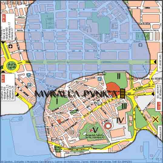 So weit mir das bekannt ist war Karthago Nova auf einer Halbinsel gelegen. Nördlich der Stadt lag eine große Lagune und vom Meer führte südwestlich der Stadt ein breiter Kanal in diese Lagune, so dass die Stadt im Westen, im Osten und im Süden von Wasser umgeben war und nur nach Nordosten/Osten in das Festland überging. Auf dem ehemaligen Verbindungstück zu der Halbinsel hin liegt der Castillo delos Moros, früher der Hügel des Merkur und dort wo die Befestigunslinie der Karthager die Stadt vom Land her schützte lagen zwei Hügel, der Hügel des Hephaistos, heute der Castillo de Despena Perros und der Hügel des Aletes, heute der San Jose. Zum Golf von Carthagena hin zog sich dann die Seemauer über den Hügel des Asklepios an der Südlichen Küste entlang, heute ist das der Monte Concepcion.