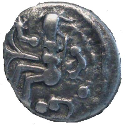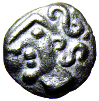 Da habt ihr noch mal ne Obole Typ Donnersberg. Für die Münzleihen kleine Interpretationshilfe zum "Apollokopf", die Rückseite das Revers mit mit den Kreisen ist erkennbar, das Avers nur für das geübte Auge. Der Apollokopf ist völlig degeneriert im Vergeich zum Vorbild Marseiller Obol. Also es ist ein stark abstrahierter Apollokopf nach Rechts. Die Haare des Kopfes oben Links, Das Auge, rechts mit Strahlen, darunter die Lippenpunkte die Nase dazwischen-