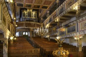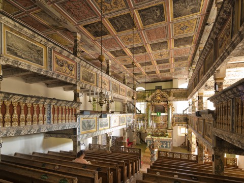 Wenn ein Kirchenboden zum Altar hin abfällt, fühlt sich ein Besucher von ihm angezogen.