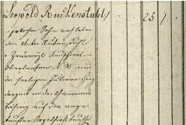 Leopold Rubenstuhl* / eherser Sohn noch leben / den Anton Rubenstuhl / o. Zaun_uzl __________ in / Oberlaufen No. 35 und / der seeligen Juliana Hinz / derzeit in der Gemeinde Frösing/Fröhing/Fröfing auf der au[f?]ge** / kauften Rogelfirkbeuthe....