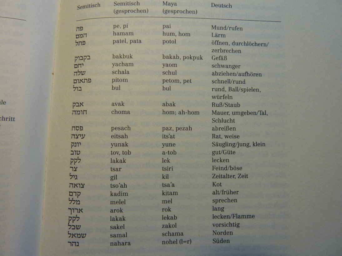 Interessant ist aber, daß es in den Maya-Sprachen bestimmte Laute *nicht* gibt, in den semitischen Sprachen dagegen schon, wie zb das /g/ oder das /f/, oder auch das /z/ (dh das stimmhafte s). Andererseits sind bei ihren "semitischen" Worten etliche, die zb den Laut /p/ enthalten, den es heute in der arabischen Sprache nicht gibt.