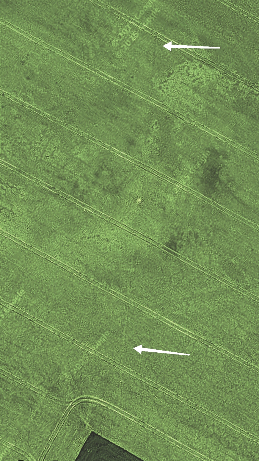 Die Entfernung zwischen Titulum und Lagereingang ist ungefähr die Hälfte der Strecke zwischen den Traktorspuren.