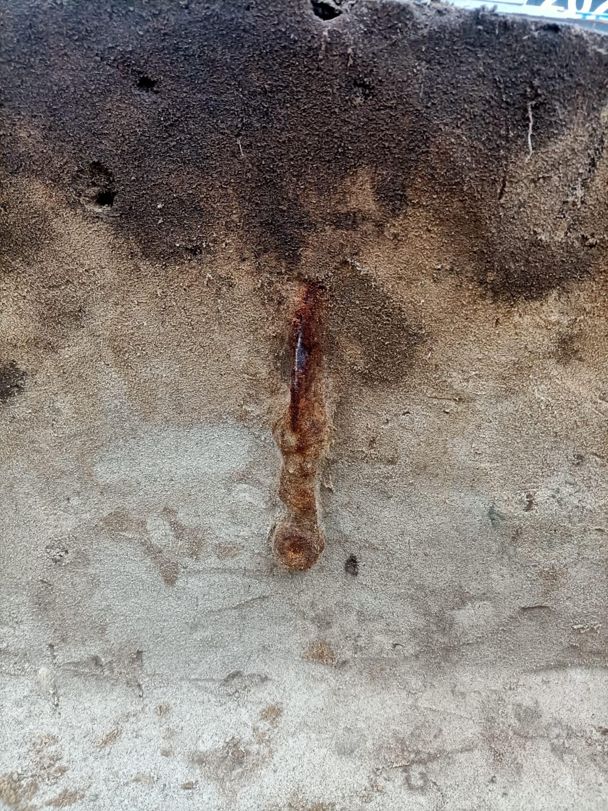 Neben römischen Denaren haben wir ein Messer gefunden welches senkrecht im Boden steht.