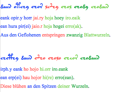 2. Die Punkte in der Transkription hab ich bereits erklärt. Ein Punkt in Zeile 2 bedeutet Bruch zwischen Wortstamm und Flexionsmarker. Zwei Punkte bedeuten den Bruch zwischen zwei Wörtern.