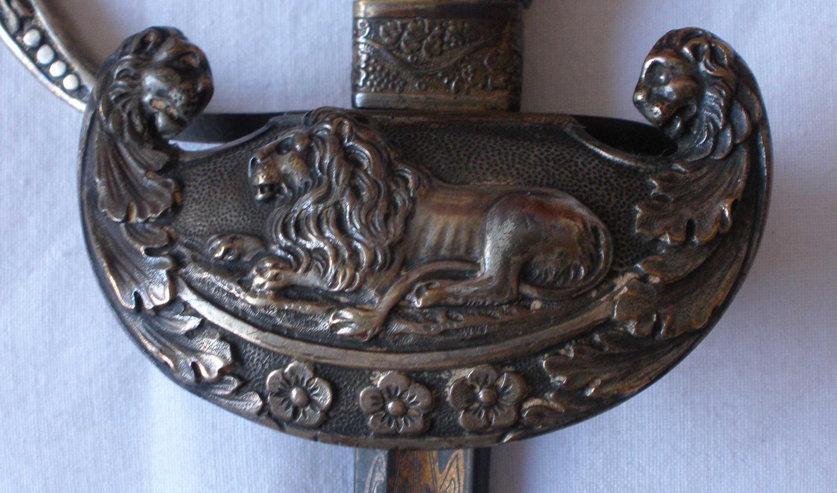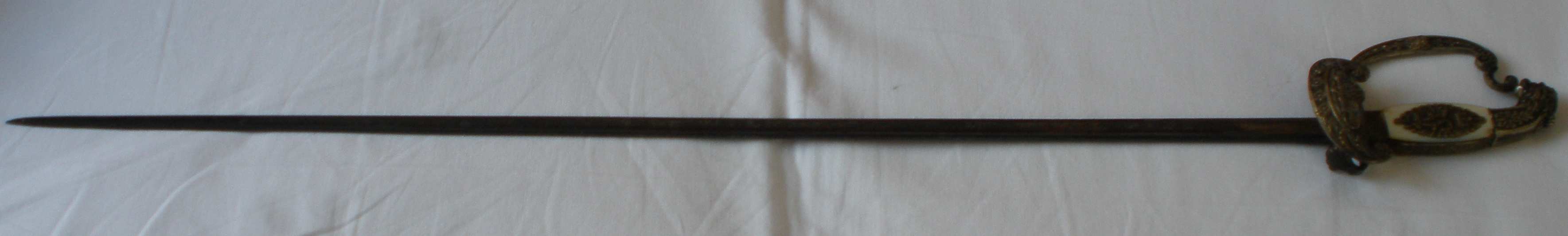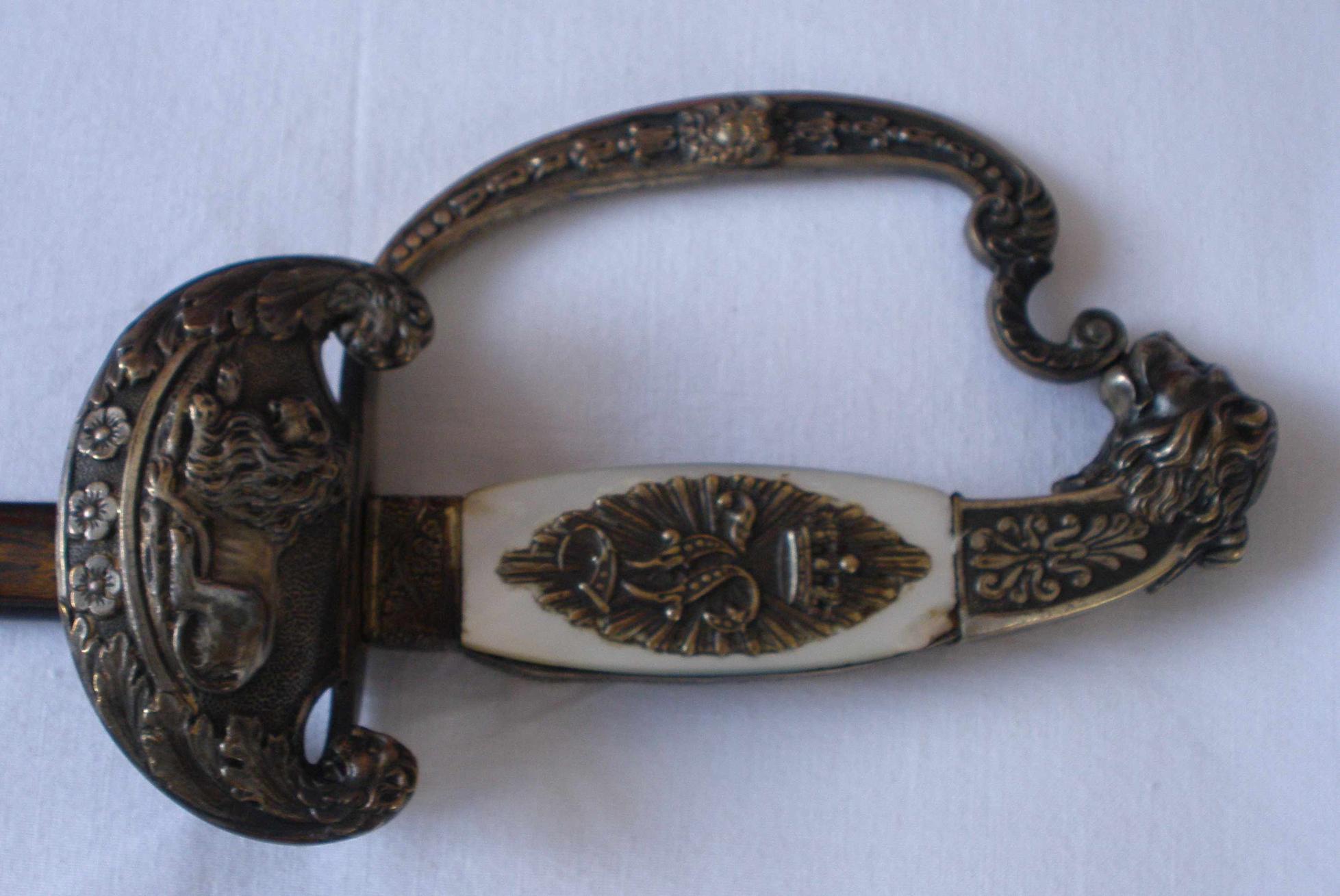 Die Hofdegen, welche auch noch durchweg im 19.Jh. zur alltäglichen Kleidung von Hofleuten gehörte, waren ja nur noch ganz kleine Waffen. Ihr Gewicht war so gering, dass nichtmal ein Wehrgehänge notwendig war, sondern diese Degen in Befestigungen, die direkt an die Hose (oft noch Kniebundhose) angenäht waren, eingeschoben werden konnte. Für eine solche Funktion wirkt mir diese Blankwaffe aber irgendwie zu schwer und zu "militärisch".