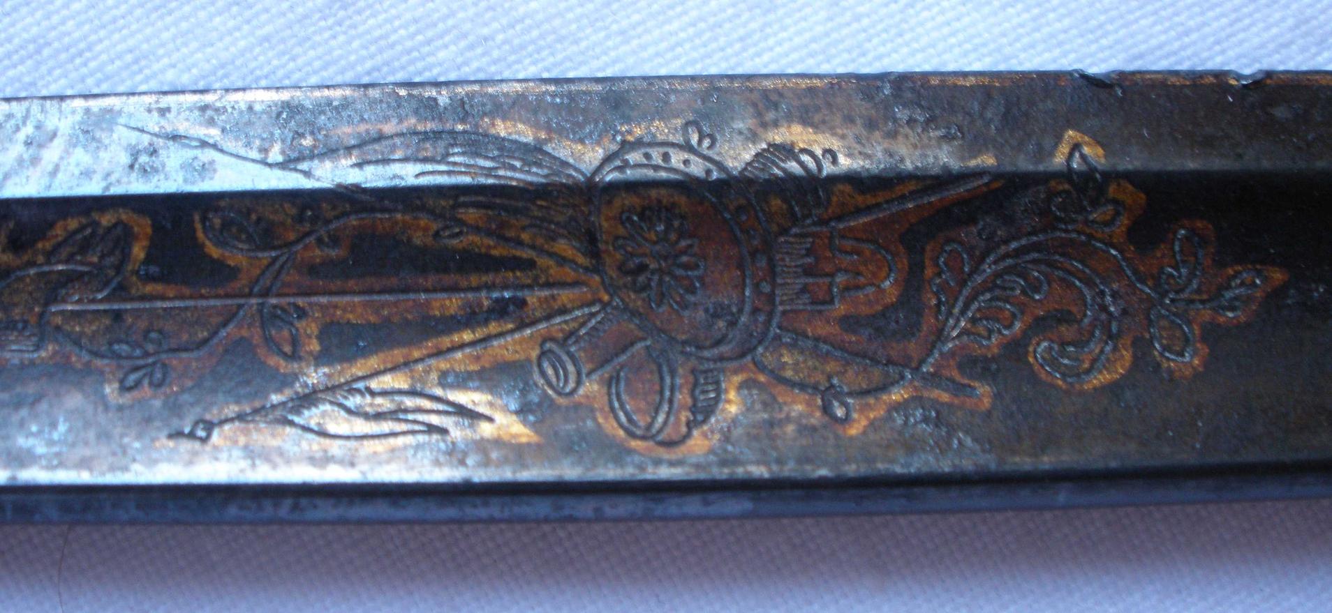 Die Form der Fassung ist typisch 18. Jahrhundert. Dekoration und Klingenform jedoch eher 19. Ich würde also auch auf eine Waffe aus der Zeit des Historismus deuten.