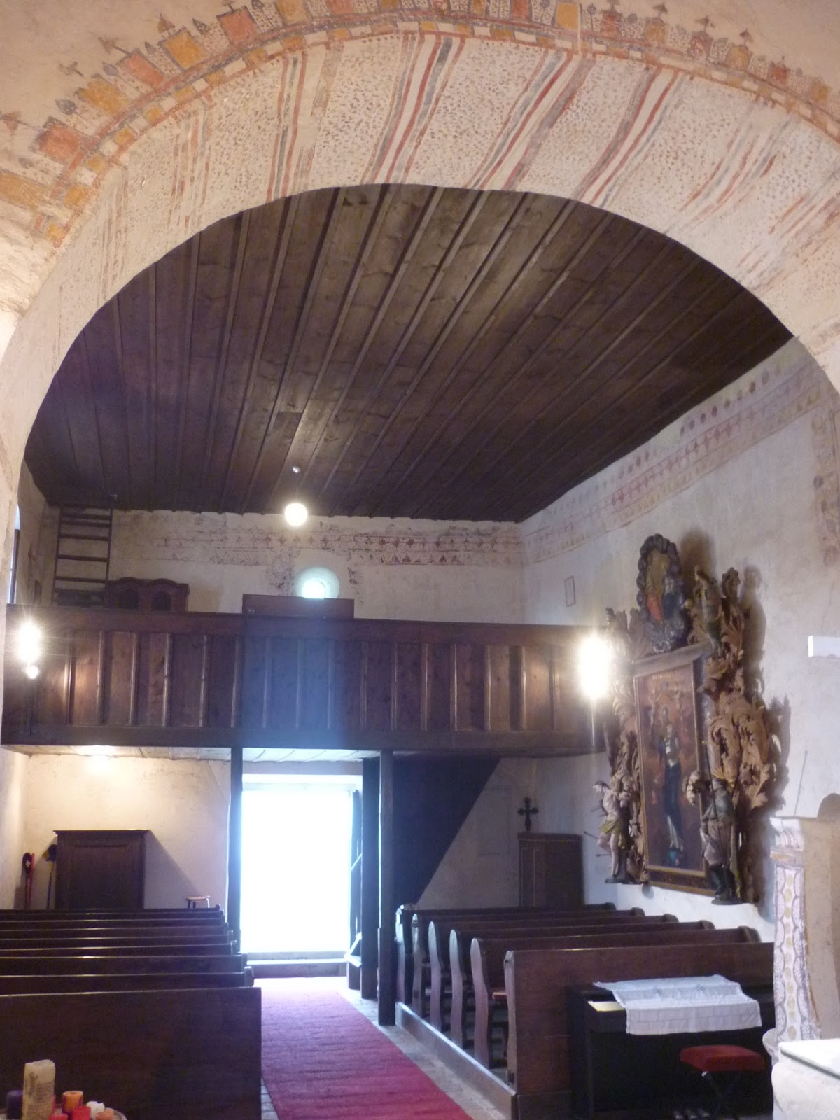 • Tod: die Grabmale (mit großer Wahrscheinlichkeit als solche gedacht) auf der Innenseite des Chorbogens versteckt, sodass sie dem Priester den Blick auf die Lebenden ergänzen.