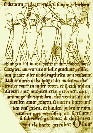 Die Historizität dieser Darstellung wage ich anzuzweifeln und fordere die Quellenbelege dafür ein. Mir ist der Olifant aus dem Rolandslied ein Begriff, in den Abbildungen der HSS ist er in der Form eines Elefantenstoßzahns dargestellt und der Aachener Domschatz besitzt auch zwei solcher Olifanten - einer dem Roland, der zweite Karl dem großen gehörig, beide aber erst aus dem Hochmittelalter