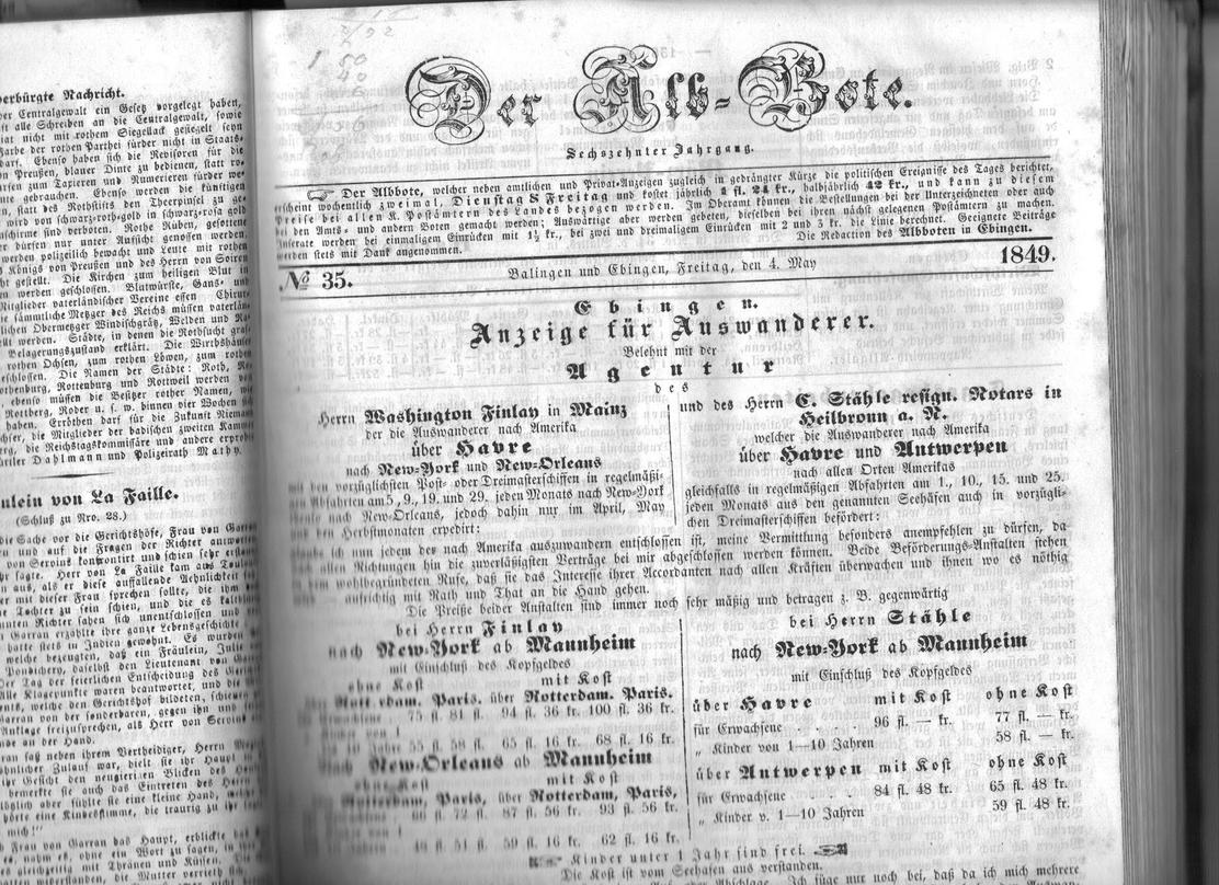 In meinen Zeitungen sind Aufrufe die Menge abgedruckt, "der und der will auswandern, wer noch Forderungen hat muss die binnen 14 Tagen da und da anmelden, sonst sind sie verfallen"